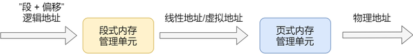由于此时由段式内存管理映射而成的地址不再是“物理地址”了,Intel 就称之为“线性地址”(也称虚拟地址)。于是,段式内存管理先将逻辑地址映射成线性地址,然后再由页式内存管理将线性地址映射成物理地址。