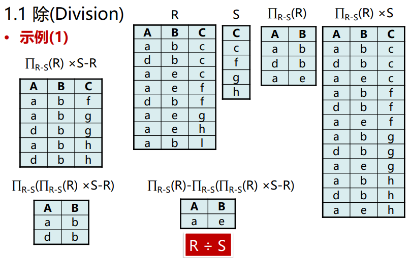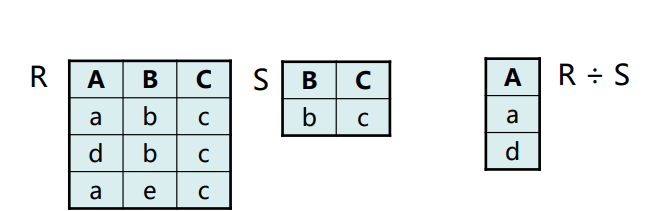 数学描述:R ÷ S = { t | t ∈ \(\Pi_{R-S}\)(R) and ∀u ∈ S (tu∈ R)}
