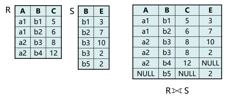 如果\(R ∩ S = ϕ\),则\(R \Join S = R×S\) - 注意:要在结果中去掉重复的属性列