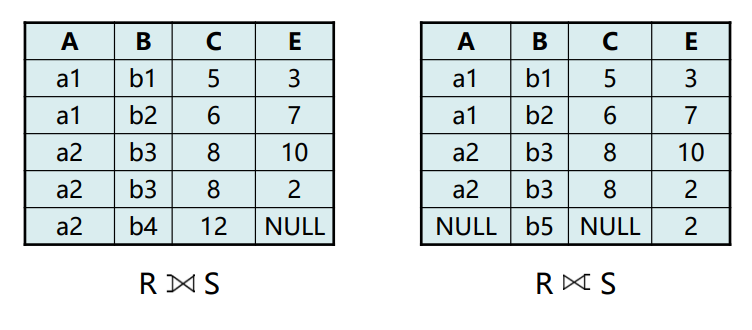- 数学描述:\(R \Join_{\theta} S = \sigma_{\theta} (R×S)\) ,是将一个选择运算和一个笛 卡儿乘积运算合并为的单独一个运算