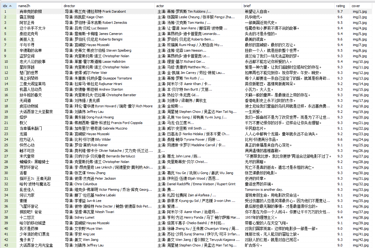 | 1 | 肖申克的救赎 | 弗兰克·德拉邦特 | 蒂姆·罗宾斯 | 希望让人自由 | 9.7 | ./imgs/xsk.jpg |