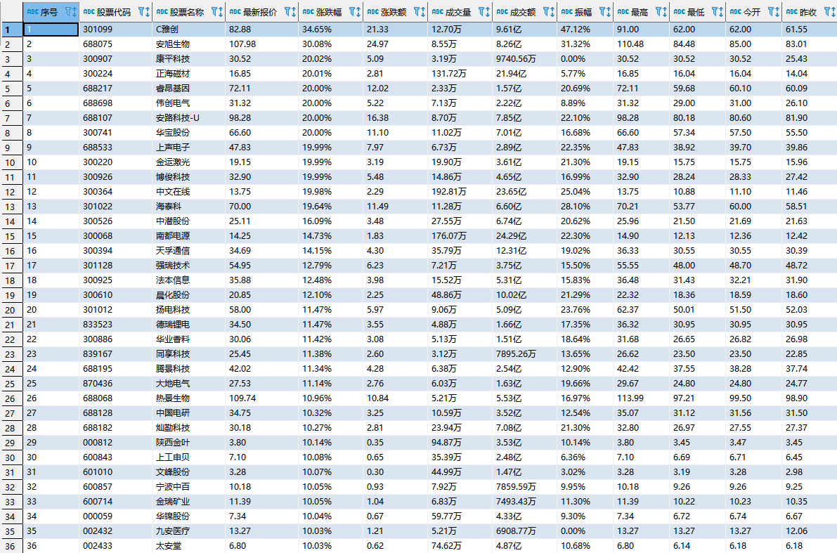 | 序号 | 股票代码 | 股票名称 | 最新报价 | 涨跌幅 | 涨跌额 | 成交量 | 成交额 | 振幅 | 最高 | 最低 | 今开 | 昨收 |
