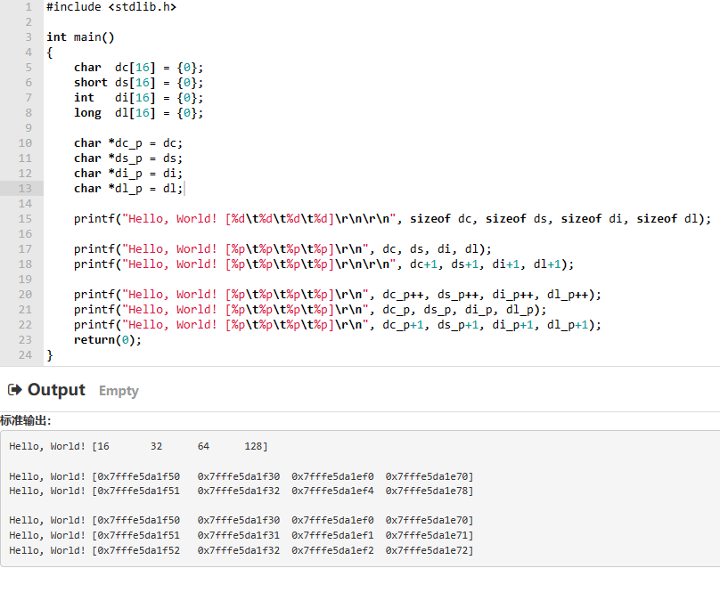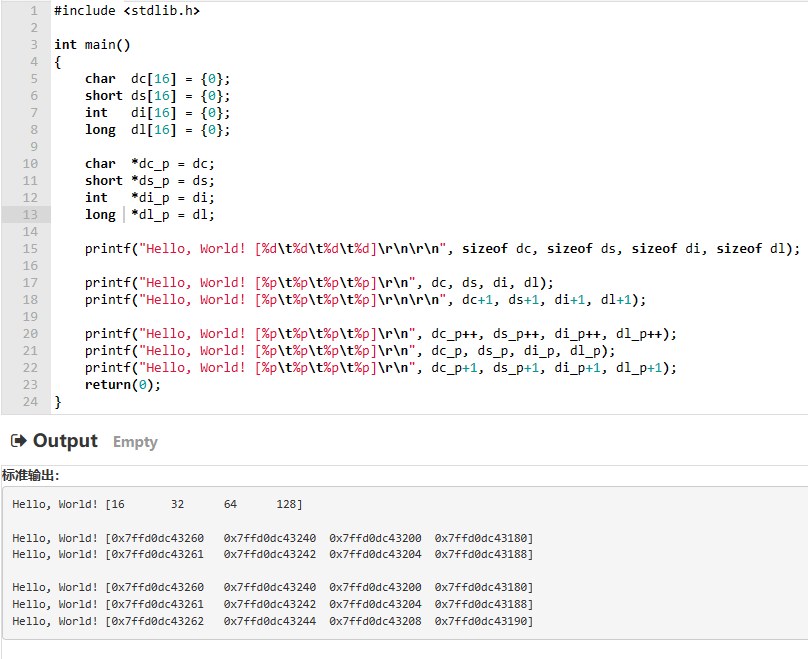 1 #include <stdlib.h> 2 3 int main() 4 { 5 char dc[16] = {0}; 6 short ds[16] = {0}; 7 int di[16] = {0}; 8 long dl[16] = {0}; 9 10 char *dc_p = dc; 11 short *ds_p = ds; 12 int *di_p = di; 13 long *dl_p = dl; 14 15 printf("Hello, World! [%d\t%d\t%d\t%d]\r\n\r\n", sizeof dc, sizeof ds, sizeof di, sizeof dl); 16 17 printf("Hello, World! [%p\t%p\t%p\t%p]\r\n", dc, ds, di, dl); 18 printf("Hello, World! [%p\t%p\t%p\t%p]\r\n\r\n", dc+1, ds+1, di+1, dl+1); 19 20 printf("Hello, World! [%p\t%p\t%p\t%p]\r\n", dc_p++, ds_p++, di_p++, dl_p++); 21 printf("Hello, World! [%p\t%p\t%p\t%p]\r\n", dc_p, ds_p, di_p, dl_p); 22 printf("Hello, World! [%p\t%p\t%p\t%p]\r\n", dc_p+1, ds_p+1, di_p+1, dl_p+1); 23 return(0); 24 }