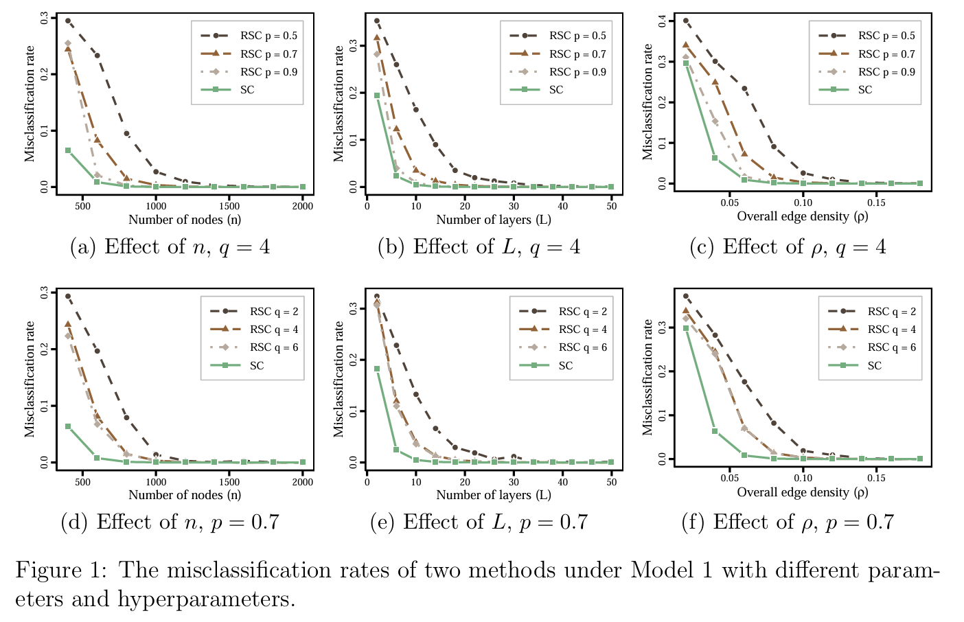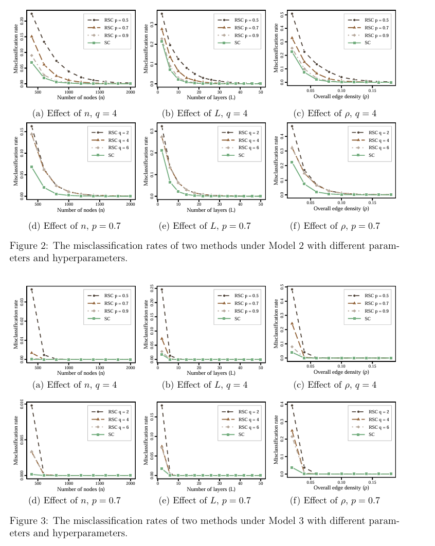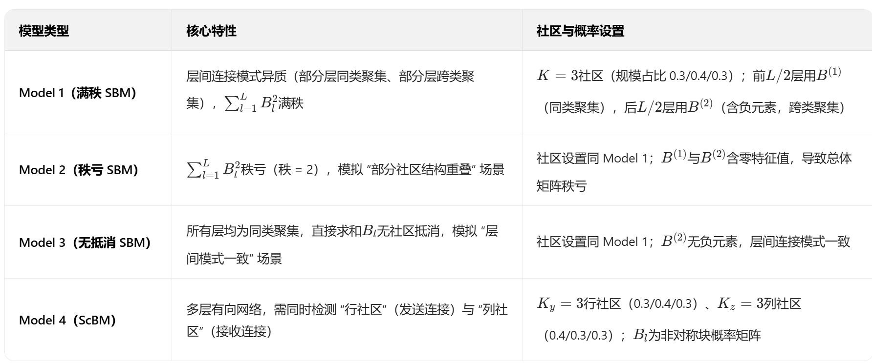 仿真实验基于多层随机块模型(Multi-layer SBM)与多层随机共块模型(Multi-layer ScBM,用于有向网络)生成数据,通过控制节点数\(n\)、层数\(L\)稀疏度