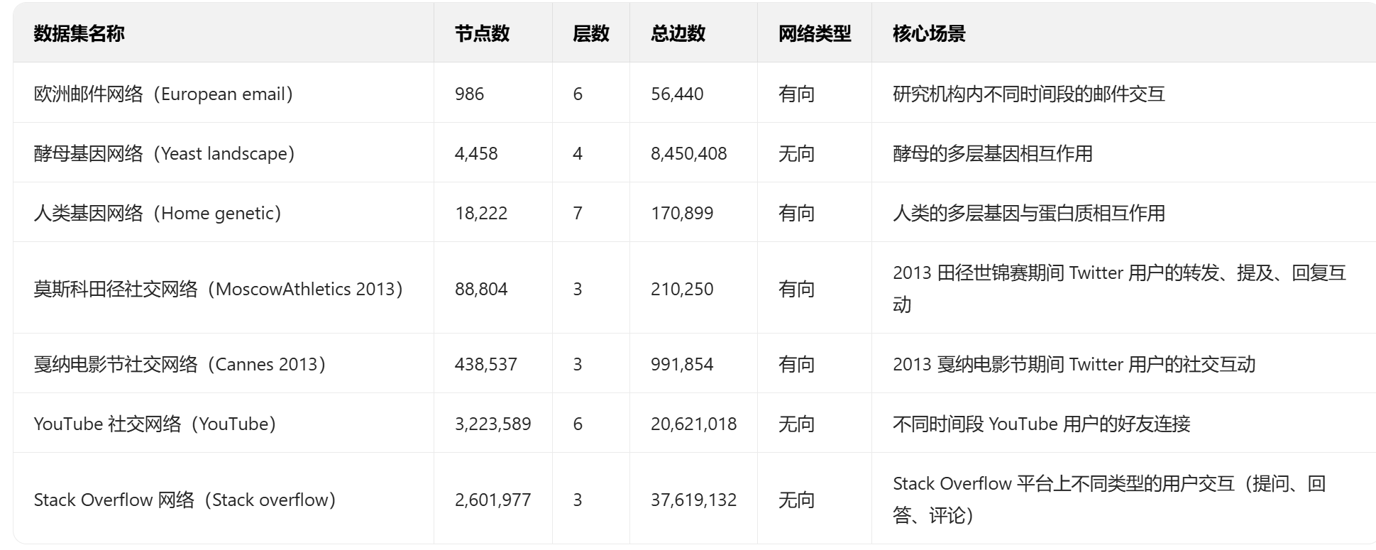 选取 7 个涵盖有向 / 无向、小规模 / 大规模的多层网络数据集,重点验证 RSC 在实际大规模数据上的计算效率优势,并在小规模数据上验证精度一致性。