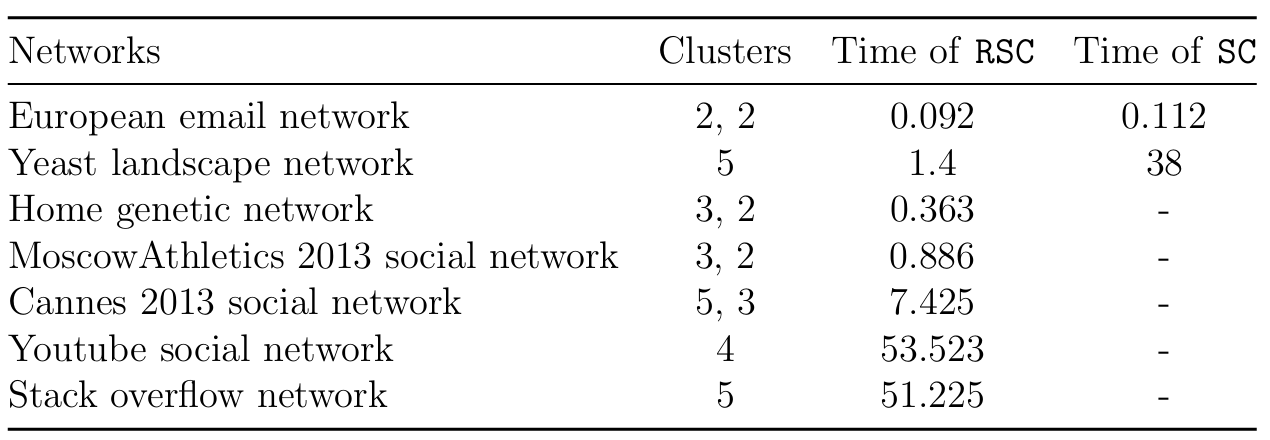真实数据的精度评估不充分:论文在真实数据实验中,仅通过 “与 SC 结果的相似度(ARI/AMI)” 验证 RSC 的精度,缺乏 “外部标签”(如节点的真实社区归属)的直接验证,精度评估的说服力有限