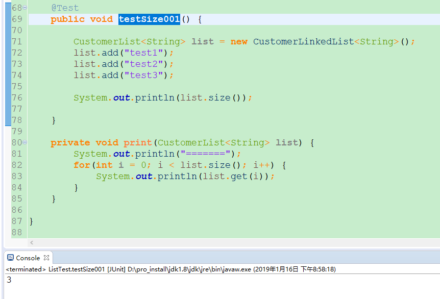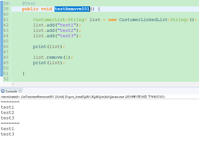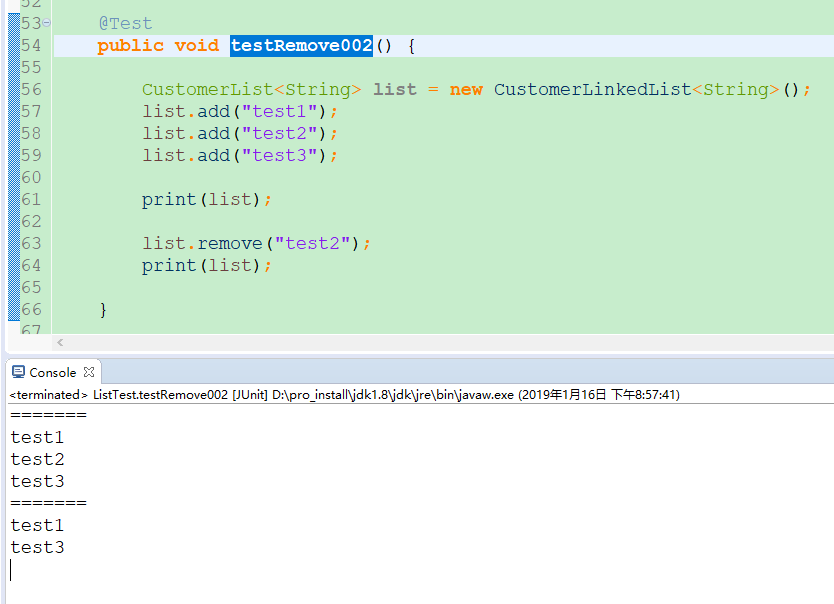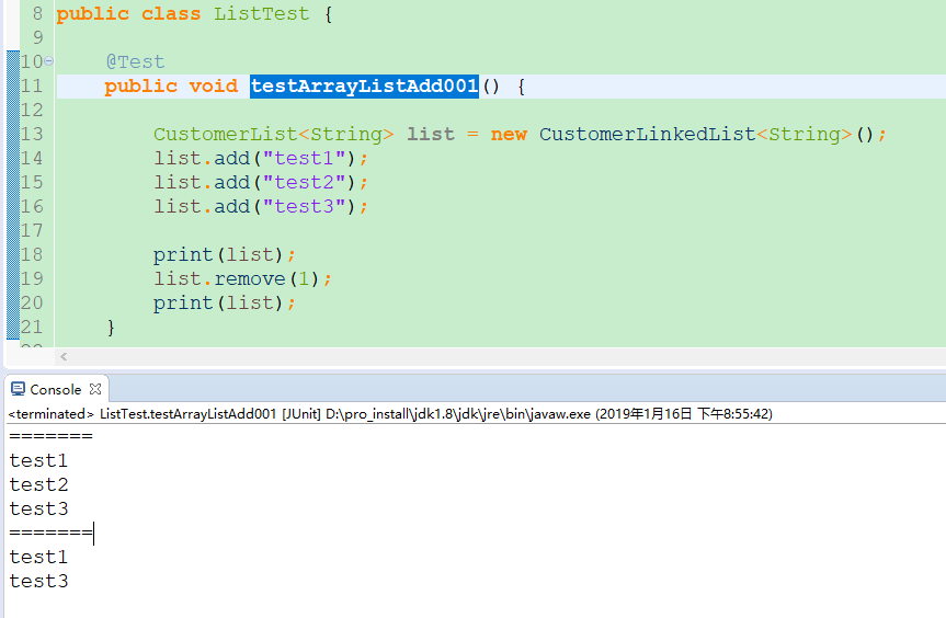 1 public class ListTest { 2 3 @Test 4 public void testArrayListAdd001() { 5 6 CustomerList<String> list = new CustomerLinkedList<String>(); 7 list.add("test1"); 8 list.add("test2"); 9 list.add("test3"); 10 11 print(list); 12 list.remove(1); 13 print(list); 14 } 15 16 @Test 17 public void testArrayListAdd002() { 18 19 CustomerList<String> list = new CustomerLinkedList<String>(); 20 list.add("test1"); 21 list.add("test2"); 22 list.add("test3"); 23 24 print(list); 25 26 list.add(0, "test0"); 27 print(list); 28 29 } 30 31 @Test 32 public void testRemove001() { 33 34 CustomerList<String> list = new CustomerLinkedList<String>(); 35 list.add("test1"); 36 list.add("test2"); 37 list.add("test3"); 38 39 print(list); 40 41 list.remove(1); 42 print(list); 43 44 } 45 46 @Test 47 public void testRemove002() { 48 49 CustomerList<String> list = new CustomerLinkedList<String>(); 50 list.add("test1"); 51 list.add("test2"); 52 list.add("test3"); 53 54 print(list); 55 56 list.remove("test2"); 57 print(list); 58 59 } 60 61 @Test 62 public void testSize001() { 63 64 CustomerList<String> list = new CustomerLinkedList<String>(); 65 list.add("test1"); 66 list.add("test2"); 67 list.add("test3"); 68 69 System.out.println(list.size()); 70 71 } 72 73 private void print(CustomerList<String> list) { 74 System.out.println("======="); 75 for(int i = 0; i < list.size(); i++) { 76 System.out.println(list.get(i)); 77 } 78 } 79 80 }