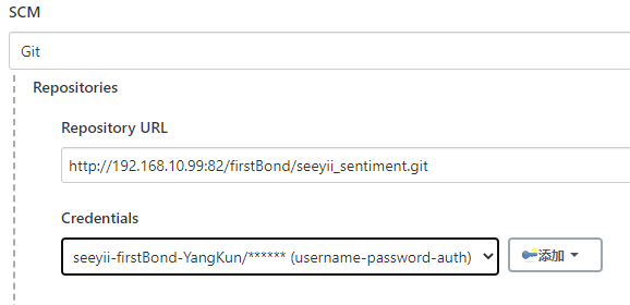 checkout([$class: 'GitSCM', branches: [[name: '*/master']], extensions: [], userRemoteConfigs: [[credentialsId: '603e2034-8fd6-49e1-accb-5454fbb84c57', url: 'http://192.168.10.99:82/firstBond/seeyii_sentiment.git']]])