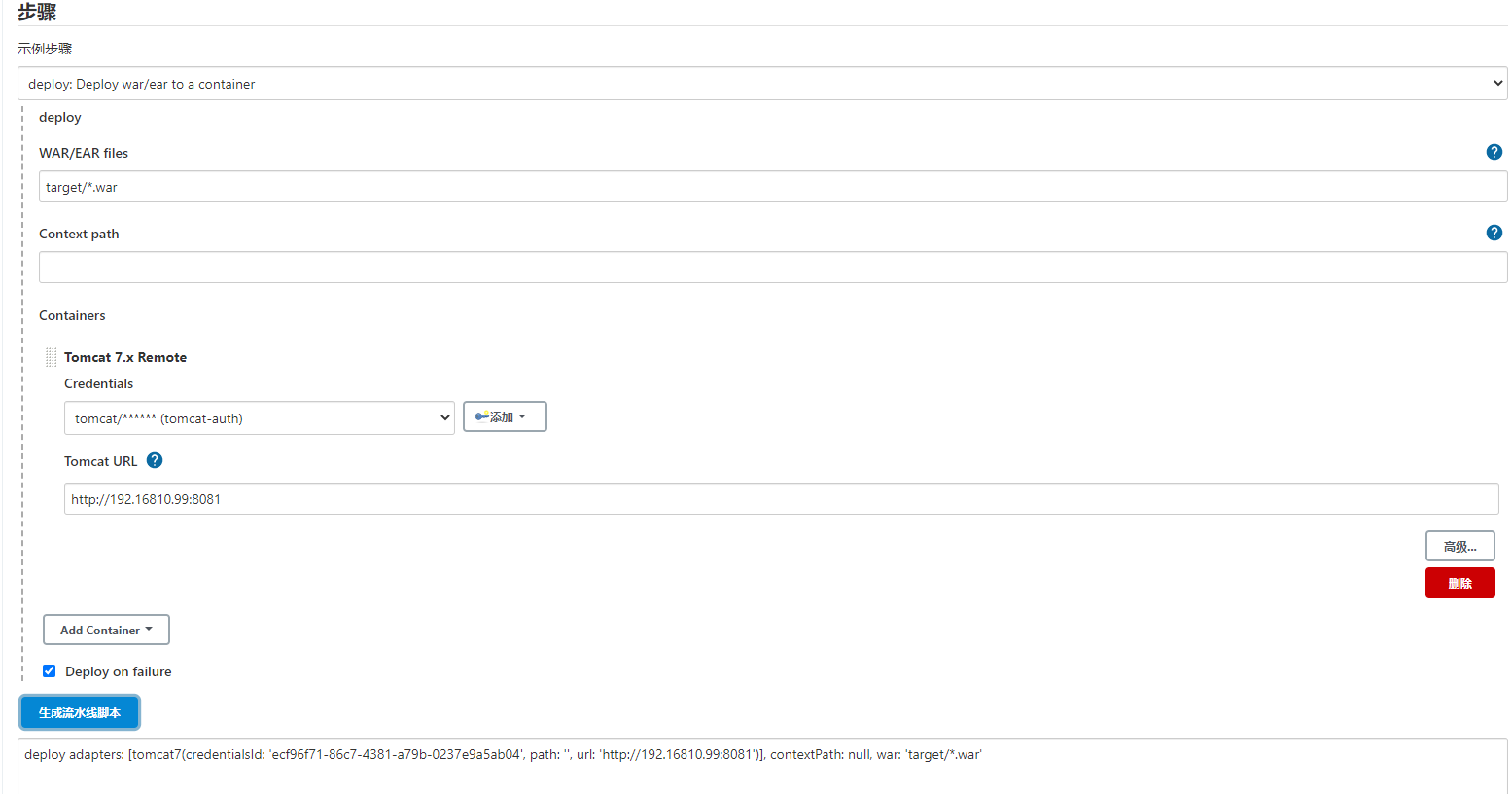 deploy adapters: [tomcat7(credentialsId: 'ecf96f71-86c7-4381-a79b-0237e9a5ab04', path: '', url: 'http://192.16810.99:8081')], contextPath: null, war: 'target/*.war'
