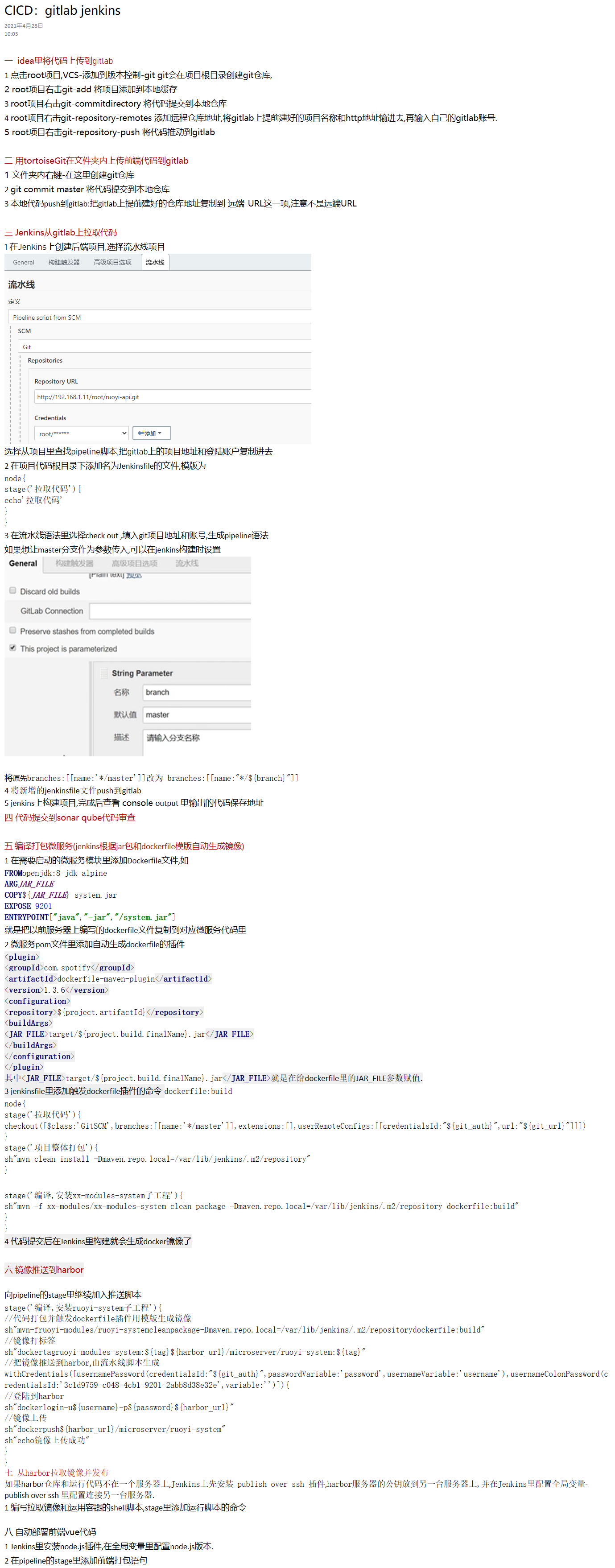 pipeline相当于把maven构建中在页面点点点的过程用代码写出来。把从gitlab拉取代码,mvn命令打jar包,Jar包和dockerFile通过publish插件推到服务器,等步骤用代码表示,如果不会写可以通过页面的代码生成器生成。