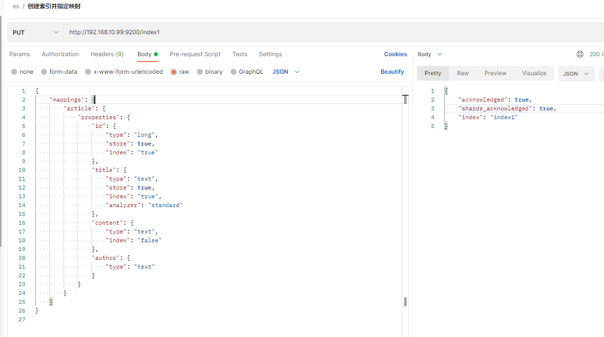 1 创建索引并指定映射: http://192.168.10.99:9200/index1