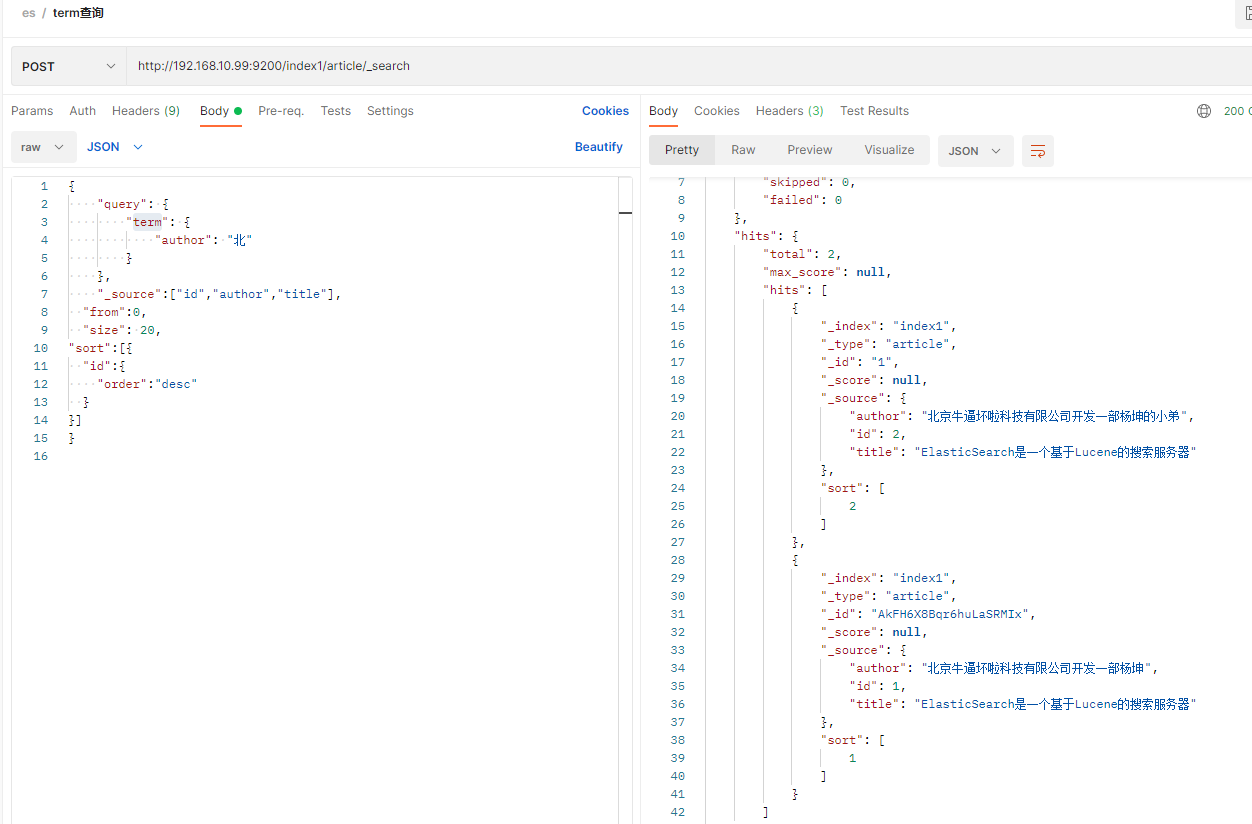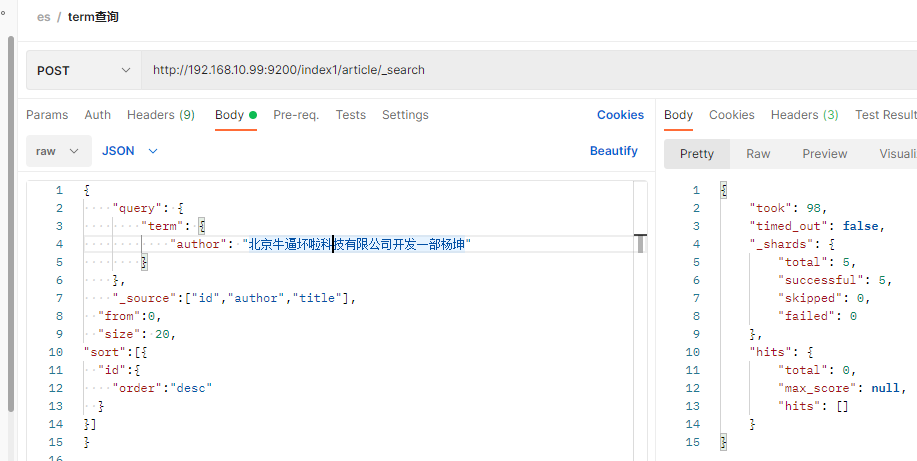 举例: 前面插入了一条author为 北京牛逼坏啦科技有限公司开发一部杨坤 的记录,现在用term查询一下