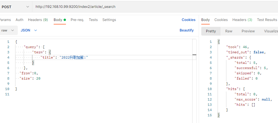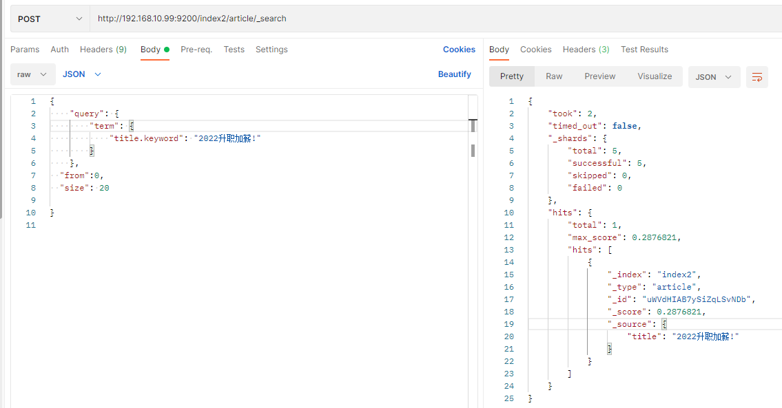 说明:单条数据插入只是学习es语法使用,生产环境可以用代码写批处理或者Logstash插入数据. 路径里article后的1是指定插入的id为1,这个id是es自己维护的_id,请求体中的id是我们手动创建的field-id