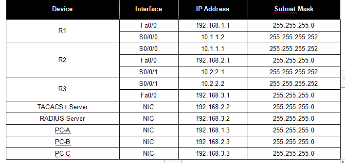R3(config)#username admin3 password admin3 R3(config)#tacacs-server host 192.168.3.2 R3(config)#tacacs-server key admin3 R3(config)#aaa new-model R3(config)#aaa authentication login default group radius local R3(config)#line console 0 R3(config-line)#login authentication default