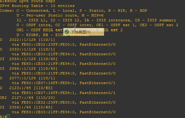 用“show ip route ospf”查看R1路由表。