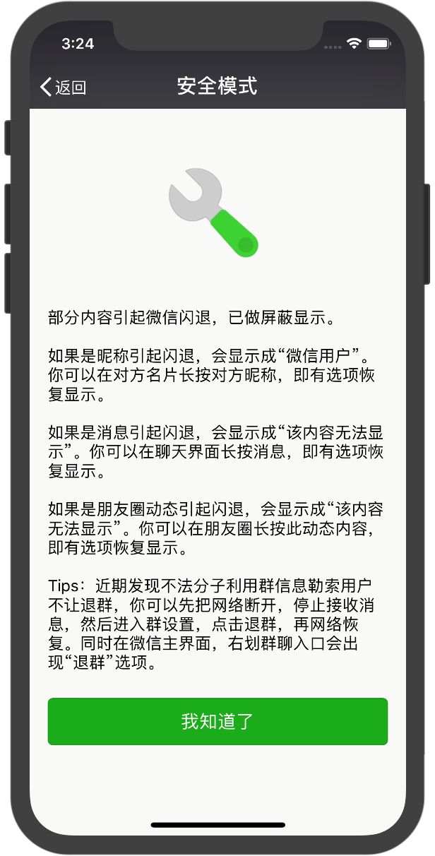 即使有了上面的N+1优化,当N很大时,客户端还是要crash很多次才能正常使用。之前有用户乱扫二维码被拉进炸群,如果不发红包,群主不停炸群;用户频繁crash,也无法退群。不少用户会选择卸载重装客户端。因此客户端要加上安全模式的机制。当客户端检测出连续三次crash,下次启动会出现安全模式的界面,提示用户如何处理: