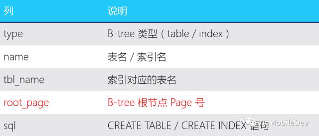 要回答这个问题,先得搞清楚sqlite_master是什么。它是一个每个SQLite DB都有的特殊的表, 无论是查看官方文档Database File Format,还是执行SQL语句 SELECT * FROM sqlite_master;,都可得知这个系统表保存以下信息: 表名、类型(table/index)、 创建此表/索引的SQL语句,以及表的RootPage。sqlite_master的表名、表结构都是固定的, 由文件格式定义,RootPage 固定为 page 1。