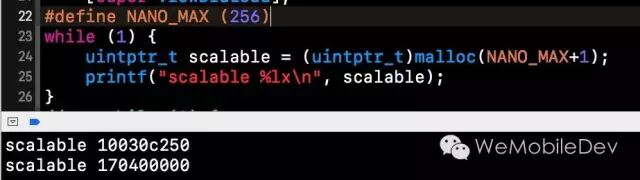 通过测试代码可以发现,小于256字节的指针确实在0x17段。然而,代码跑了一阵子之后,大于256字节的指针也落在了0x17段。