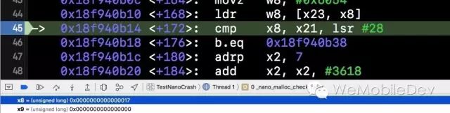 虽然这份代码里没有提供arm下的判断方式,但可以结合源码中对signature判断的函数,并通过符号断点,很快就能找到arm下比较signature的汇编。