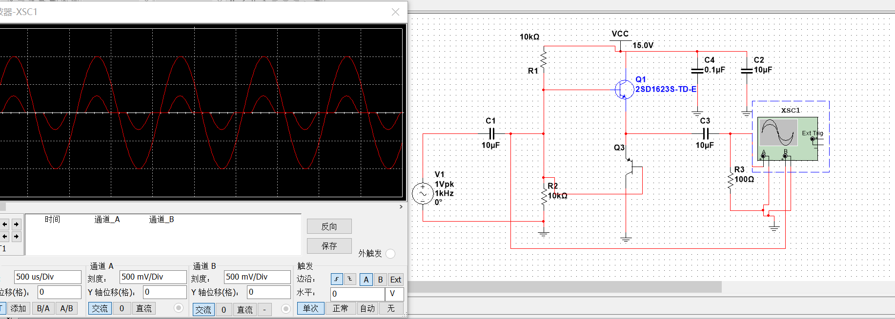 推挽型射极跟随器负载电阻R3 = 100Ω < 1052Ω , 输出波形仍没有截去。但是在输出波形的中央附近,存在正弦波上下侧没有连接上的部分,即产生交越失真。