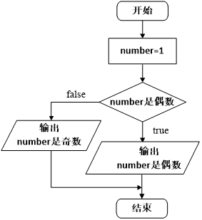 第3步:进入判断框,判断number是否为偶数,如果是偶数,则进入下面的输出框,输出number是偶数;否则进入左面的输出框,输出number是奇数;