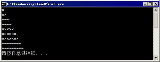 第九步,以此类推,在第3行会打印3个“*”,逐行递增,直到i的值为10时,外层循环的判断条件i <= 9结果为false,外层循环结束,整个程序也就结束了。
