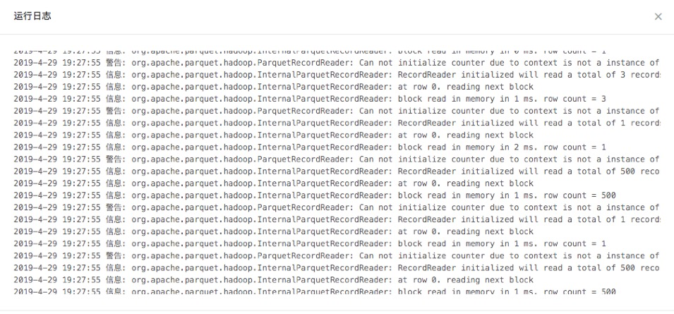 2019-4-29 19:27:55 信息: org.apache.parquet.hadoop.InternalParquetRecordReader: at row 0. reading next block