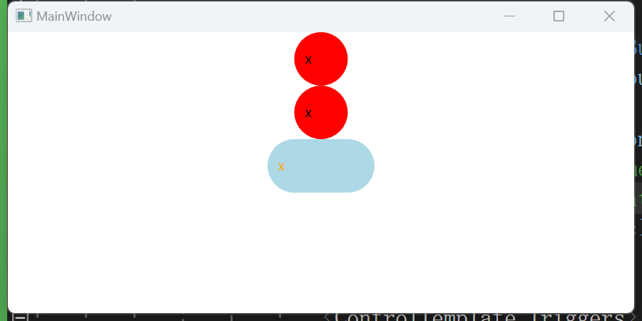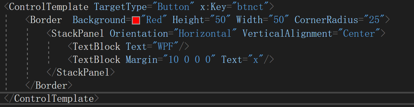 <ControlTemplate TargetType="Button" x:Key="btnct"> <Border Background="Red" Height="50" Width="50" CornerRadius="25"> <StackPanel Orientation="Horizontal" VerticalAlignment="Center"> <TextBlock Text="WPF"/> <TextBlock Margin="10 0 0 0" Text="x"/> </StackPanel> </Border> </ControlTemplate>