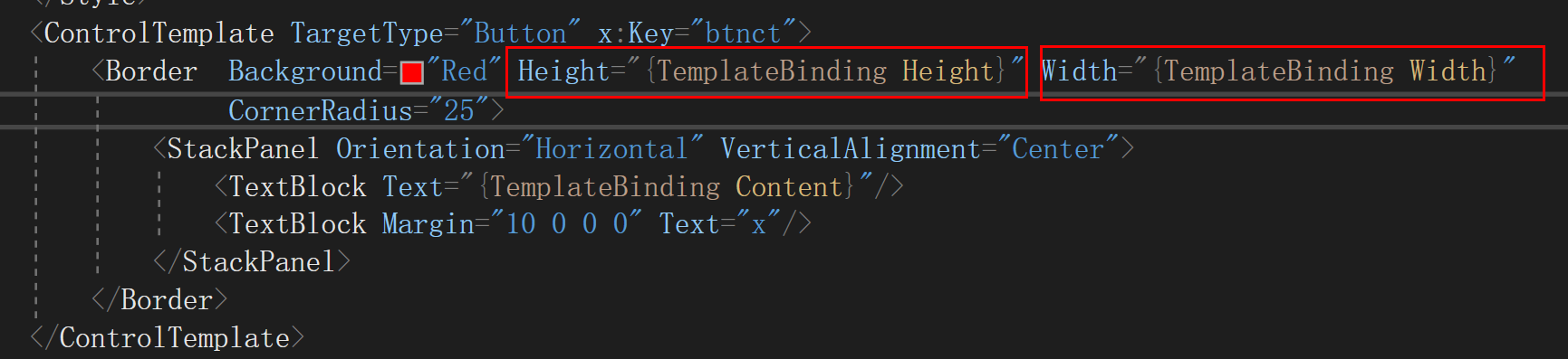 button的显示其实是由控件模板内部的border来显示的,我们设置button的height width background,最后都通过template binding设置到了border身上。