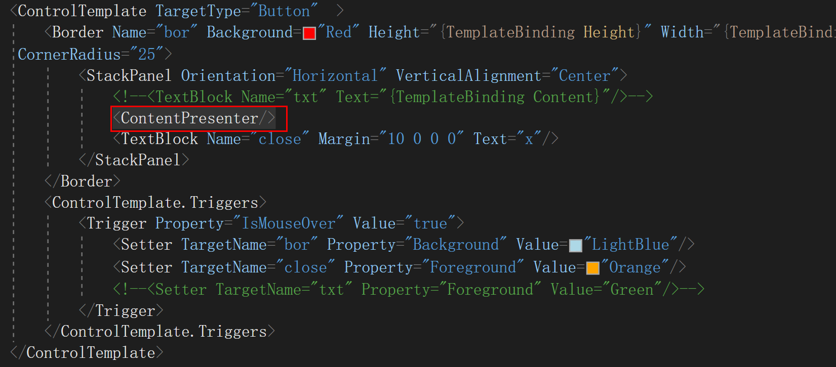 这时候需要ContentPresenter登场,只需要在控件模板内部放一个这个就可以了,它相当于一个占位符,我们传递什么,他就会显示什么