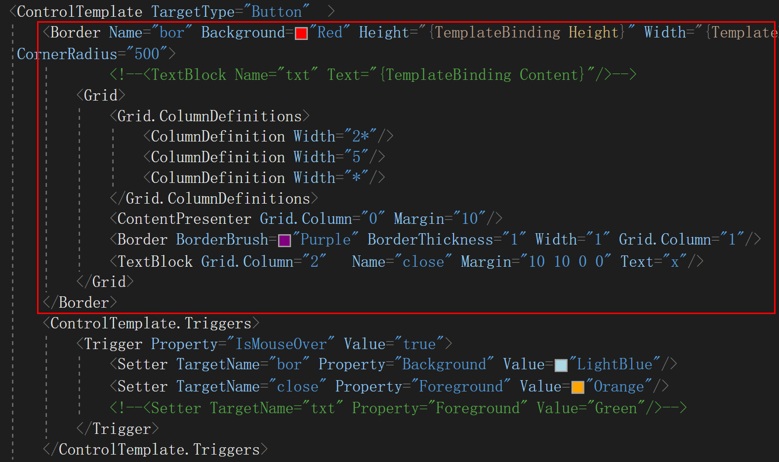 我们需要在controltemplate标签内去定义button的外观,这里就完全由我们决定了,怎么写,他就怎么显示。