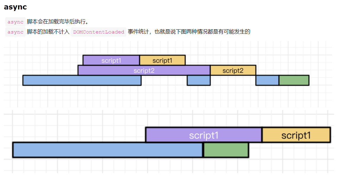 : 脚本的获取和执行是同步的。此过程中页面被阻塞,停止解析。