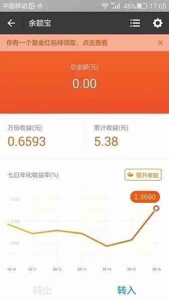 支付宝作为一个与金钱有关的软件,它余额宝页面选择了与自身比较符合的图表式布局,这种布局能直观详细地显示出信息,很适合用于数据、账单有关的APP。