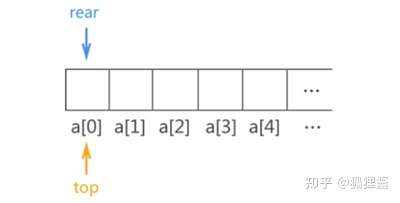 由于顺序队列初始状态没有存储任何元素,因此 top 指针和 rear 指针重合,且由于顺序队列底层实现靠的是数组,因此 top 和 rear 实际上是两个变量,它的值分别是队头元素和队尾元素所在数组位置的下标。