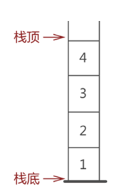 通常,栈的开口端被称为栈顶;相应地,封口端被称为栈底。因此,栈顶元素指的就是距离栈顶最近的元素,如图,栈顶元素为元素 4;同理,栈底元素指的是位于栈最底部的元素,图 中的栈底元素为元素 1。