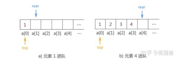 当有数据元素进队列时,对应的实现操作是将其存储在指针 rear 指向的数组位置,然后 rear+1;当需要队头元素出队时,仅需做 top+1 操作。