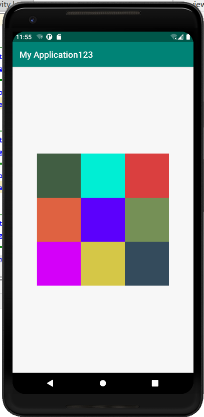 <View android:id="@+id/v_1" android:layout_width="100dp" android:layout_height="100dp" android:background="#000000" android:layout_centerInParent="true"/> <View android:id="@+id/v_2" android:layout_width="100dp" android:layout_height="100dp" android:background="#0EDB16" android:layout_above="@id/v_1" android:layout_toLeftOf="@id/v_1" /> <View android:id="@+id/v_3" android:layout_width="100dp" android:layout_height="100dp" android:background="#F80505" android:layout_above="@id/v_1" android:layout_toRightOf="@id/v_1"/> <View android:id="@+id/v_4" android:layout_width="100dp" android:layout_height="100dp" android:background="#028FFA" android:layout_below="@id/v_1" android:layout_toRightOf="@id/v_1"/> <View android:id="@+id/v_5" android:layout_width="100dp" android:layout_height="100dp" android:background="#D709FC" android:layout_below="@id/v_1" android:layout_toLeftOf="@id/v_1"/> <View android:id="@+id/v_6" android:layout_width="100dp" android:layout_height="100dp" android:background="#FCE103" android:layout_below="@id/v_2" android:layout_toLeftOf="@id/v_1"/> <View android:id="@+id/v_7" android:layout_width="100dp" android:layout_height="100dp" android:background="#03DAF8" android:layout_below="@id/v_1" android:layout_toLeftOf="@id/v_4"/> <View android:id="@+id/v_8" android:layout_width="100dp" android:layout_height="100dp" android:background="#5600F3" android:layout_below="@id/v_2" android:layout_toRightOf="@id/v_1"/> <View android:id="@+id/v_9" android:layout_width="100dp" android:layout_height="100dp" android:background="#09F1D7" android:layout_above="@id/v_1" android:layout_toRightOf="@id/v_2"/>