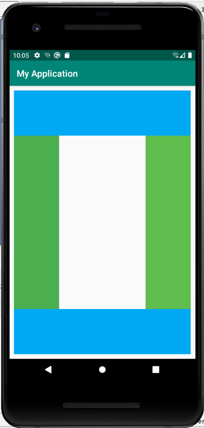 <?xml version="1.0" encoding="utf-8"?> <LinearLayout xmlns:android="http://schemas.android.com/apk/res/android" android:layout_width="match_parent" android:layout_height="match_parent" android:background="#01DFD7" android:layout_margin="15dp" android:orientation="vertical"> <LinearLayout android:layout_width="match_parent" android:layout_height="0dp" android:layout_weight="1" android:background="#3F51B5"/> <LinearLayout android:layout_width="match_parent" android:layout_height="0dp" android:layout_weight="4" android:background="#FE2E2E" android:orientation="horizontal"> <View android:layout_width="0dp" android:layout_height="match_parent" android:layout_weight="1" android:background="#8BC34A"/> <View android:layout_width="0dp" android:layout_height="match_parent" android:layout_weight="3" android:background="#FF9800"/> <View android:layout_width="0dp" android:layout_height="match_parent" android:layout_weight="1" android:background="#8BC34A"/> </LinearLayout>> <LinearLayout android:layout_width="match_parent" android:layout_height="0dp" android:layout_weight="1" android:background="#3F51B5"/> </LinearLayout>