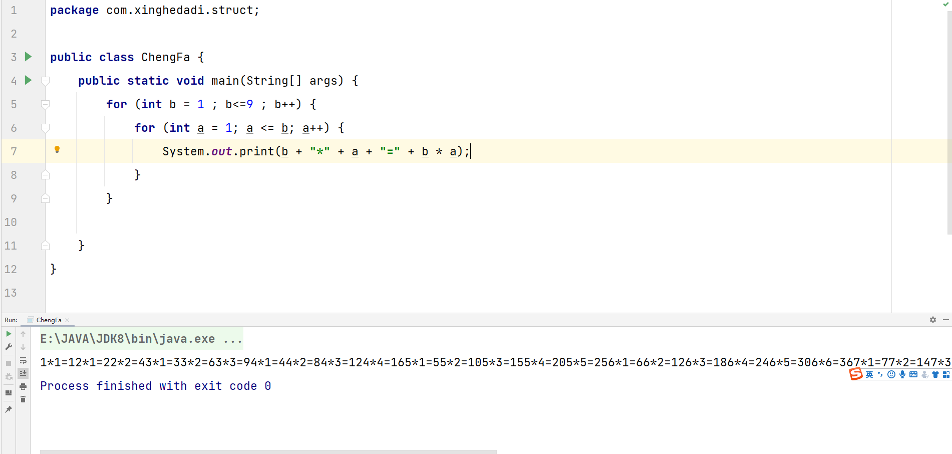 此时的1*a中,因为a会从1循环到9,所以才会生成以上乘法表的第一列,1是定死的。那么,如果1本身也成为了一个可以循环的变量,在1计算完从1 * 1到 1 * 9 的计算之后,前者循环至2 ,然后在进行从2 * 2到2 * 9 的循环计算,以此类推,直到9 * 9,这是否可行呢?