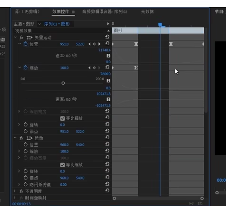 拉伸复制后的字幕条时,可以保护部分关键帧不被字幕条拉伸。拉伸下图右侧“图形”栏的左右两侧,高亮区域所覆盖的关键帧不会发生变化。