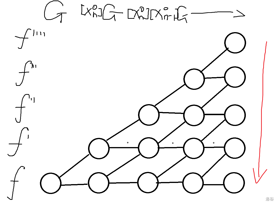 直接转移即可。对于上图中从右往左数第 \(i\) 列(\(0\) 开始标号),从上一行转移的转移系数是 \([x_i^1]{}^{i+1}G\)。