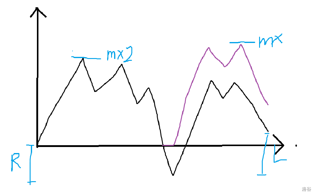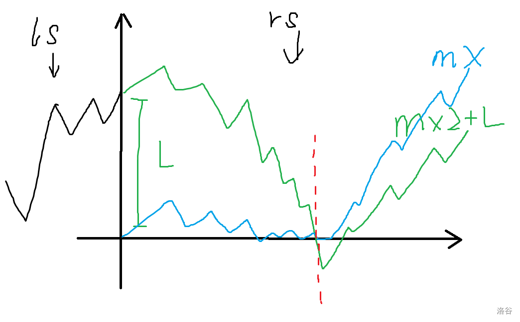 现在就是要维护区间匹配过程中的 \(mx\) 即可。即画一条从原点开始的折线,如果碰到 \(x\) 轴就不减了,整个过程的最大值。下面是我在模拟赛时想到的做法: