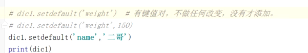 # 通过键值对直接增加 dic = {'name': '太白', 'age': 18} dic['weight'] = 75 # 没有weight这个键,就增加键值对 print(dic) # {'name': '太白', 'age': 18, 'weight': 75} dic['name'] = 'barry' # 有name这个键,就成了字典的改值 print(dic) # {'name': 'barry', 'age': 18, 'weight': 75}