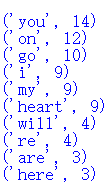 str=''' Every night in my dreams I see you,I feel you That is how I know you go on Far across the distance And spaces between us You have come to show you go on Near far Wherever you are I believe That the heart does go on Once more you open the door And you're here in my heart And my heart will go on and on Love can touch us one time And last for a lifetime And never let go till we're gone Love was when I loved you One true time I hold to In my life well always go on Near far Wherever you are I believe That the heart does go on Once more you open the door And you're here in my heart And my heart will go on and on you're here There's nothing I fear And I know That my heart will go on We'll stay forever this way You are safe in my heart And my heart will go on and on ''' #逗号和略写 , ' sym=list("',") for i in sym: str=str.replace(i," ") #小写 str=str.lower() #按空格分裂单词 str=str.split() dictionary=dict() #单词和个数存到字典中 for i in str: dictionary[i]=str.count(i) #语法词删去 pron = ["for", "to", "the", "and", "of", "in","that","have","has","a","can","not"] for i in pron: if i in dictionary.keys(): del dictionary[i] #按value值大小排序 dictionary=sorted(dictionary.items(),key=lambda item:item[1],reverse=True) #输出 for i in range(10): print(dictionary[i])