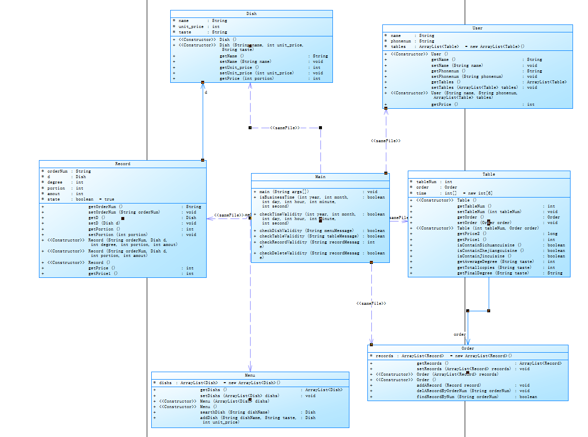 - Dish类表示菜品,包含菜品名称、单价和菜品类型。