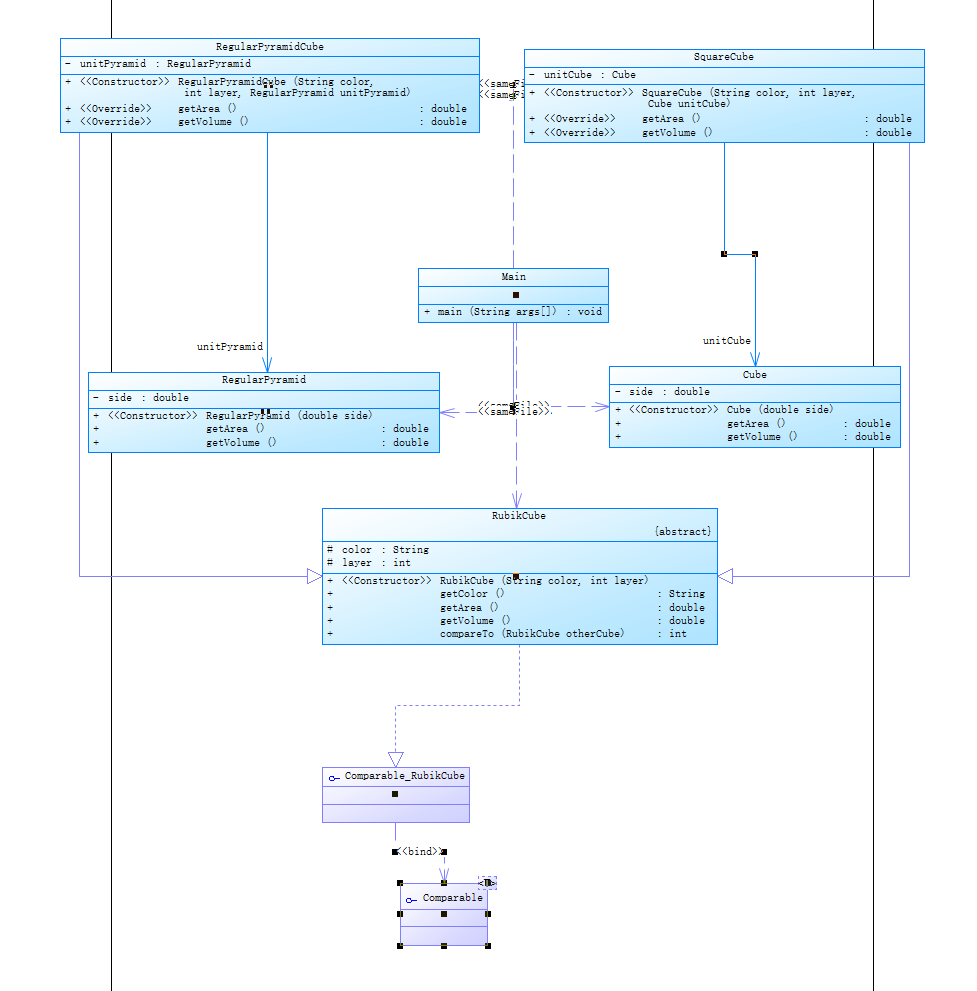 本题要求按照魔方的体积进行排序,因此需要在RubikCube类中实现Comparable接口,并重写compareTo方法。
