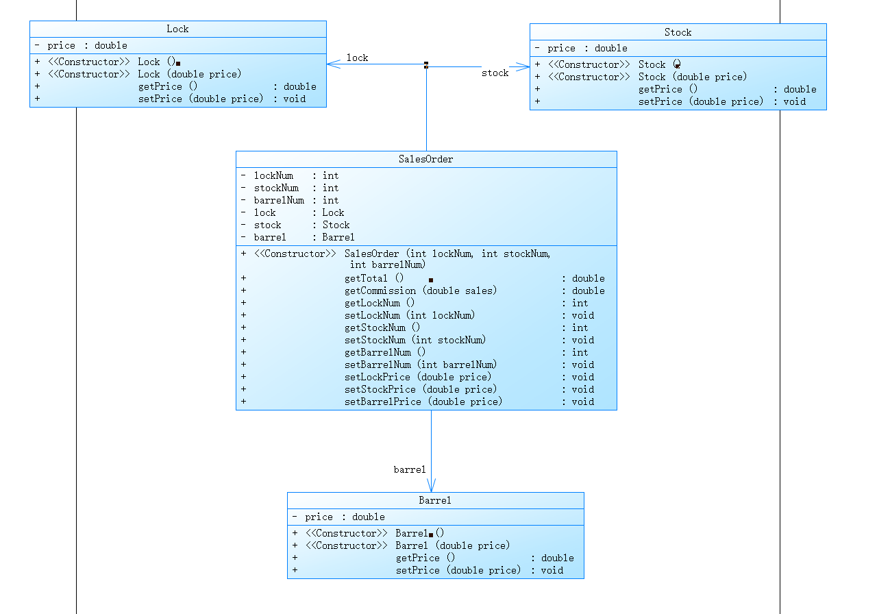 代码实现了一个销售订单类(SalesOrder)及其相关的枪管(Barrel)、枪托(Stock)、枪机(Lock)类。其中,销售订单类包含了锁(Lock)数量、枪托(Stock)数量和枪管(Barrel)数量等属性,以及计算销售总额和佣金的方法。