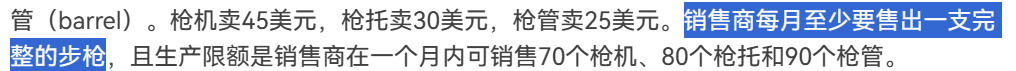 前亚利桑那州境内的一位步枪销售商销售密苏里州制造的步枪机(lock)、枪托(stock)和枪管(barrel)。枪机卖45美元,枪托卖30美元,枪管卖25美元。销售商每月至少要售出一支完整的步枪,且生产限额是销售商在一个月内可销售70个枪机、80个枪托和90个枪管。