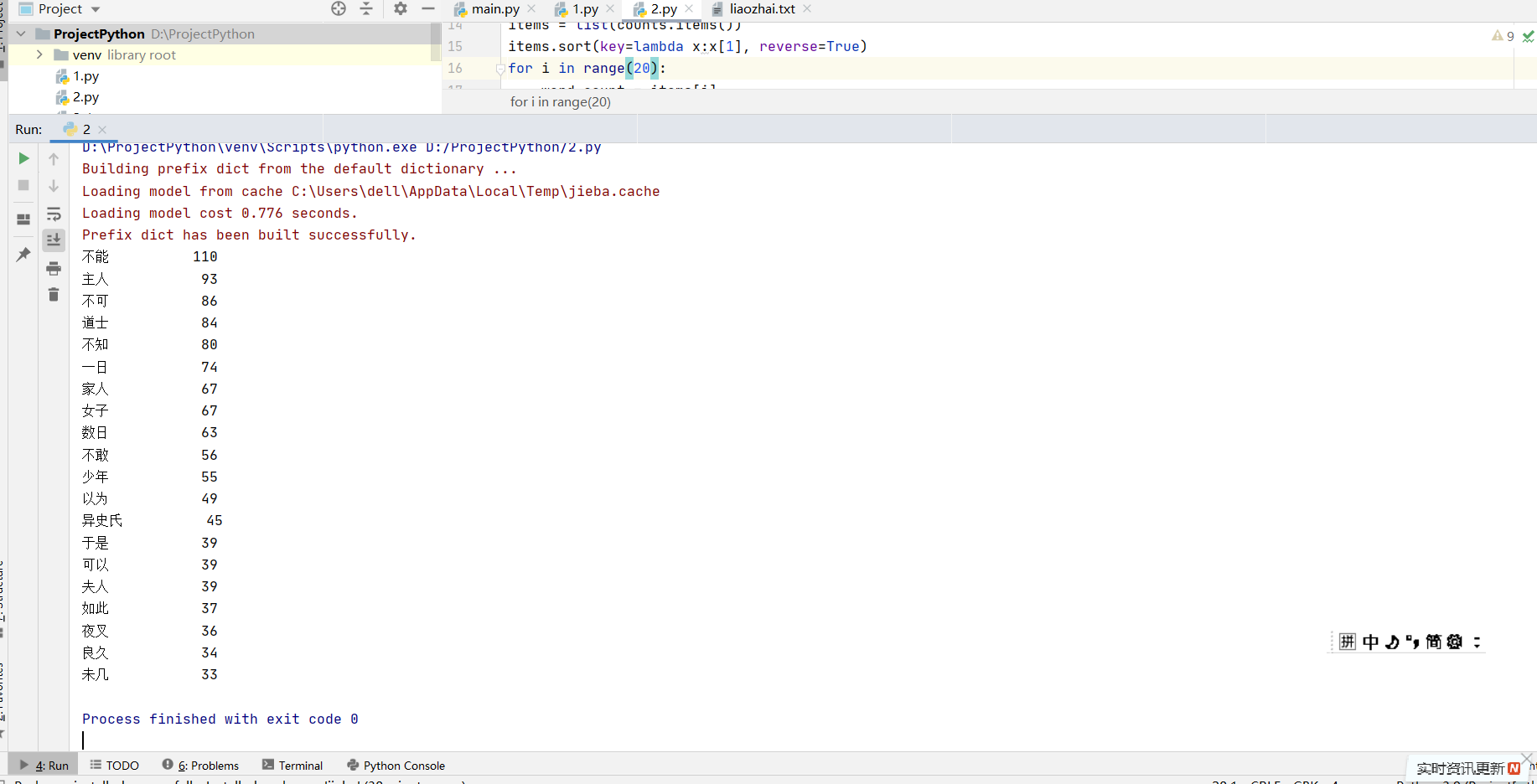 import jieba f = open(r'C:\liaozhai.txt', mode="r", encoding='gbk') txt=f.read() words = jieba.lcut(txt) counts = {} for word in words: if len(word) == 1: continue else: counts[word] =counts.get(word,0)+1 items = list(counts.items()) items.sort(key=lambda x:x[1], reverse=True) for i in range(20): word,count = items[i] print (u"{0:<10}{1:>5}".format(word, count))