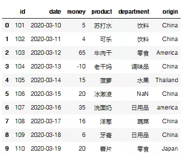 # 列表和字典均可传入DataFrame,我这里用的是字典传入: data=pd.DataFrame({ "id":np.arange(101,111), # np.arange会自动输出范围内的数据,这里会输出101~110的id号。 "date":pd.date_range(start="20200310",periods=10), # 输出日期数据,设置周期为10,注意这里的周期数应该与数据条数相等。 "money":[5,4,65,-10,15,20,35,16,6,20], # 设置一个-10的坑,下面会填(好惨,自己给自己挖坑,幸亏不准备跳~) "product":['苏打水','可乐','牛肉干','老干妈','菠萝','冰激凌','洗面奶','洋葱','牙膏','薯片'], "department":['饮料','饮料','零食','调味品','水果',np.nan,'日用品','蔬菜','日用品','零食'], # 再设置一个空值的坑 "origin":['China',' China','America','China','Thailand','China','america','China','China','Japan'] # 再再设置一个america的坑 }) data # 输出查看数据集
